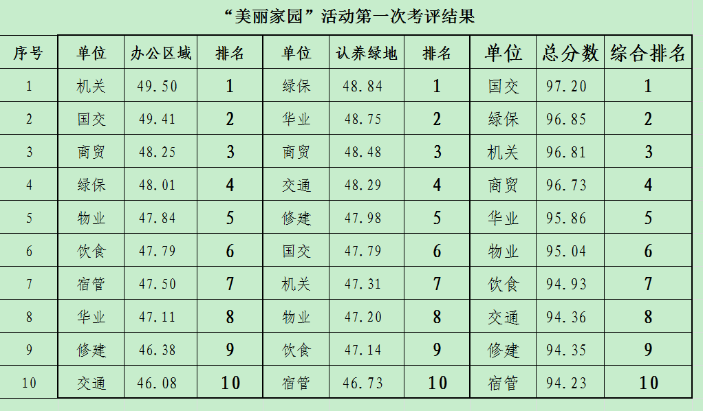 按集团“美丽家园、从我做起”爱绿护绿志愿活动相关精神,上周集团已对各部门办公区域及绿地责任区进行了第一次考评,现将考评结果公示如下: