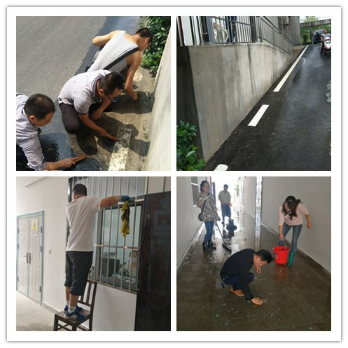 修建中心工程队的小伙子们拿着工具把外围墙面、道路的边边角角整理一新;绿保服务中心的洒水车把实验物质部外围墙面、道路清洗干净;楼道里,实验物质部的同志和物业中心的兄弟姐妹们一铲、二洗、三清洁。