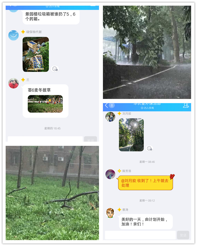 前一阵子武汉连降暴雨,所幸我农地势较高,不至于像武大、华科一般“水漫珞珈山”,但安全检查必不可少。待雨势稍弱的这天,还未破晓,何老师便带领着绿保网格化团队开始巡查校园,着重检查是否有下水道堵塞和树木被吹倒的情况,发现异常就赶紧上报到绿保中心工作QQ群里,就好像人工雷达,给领导和其他部门提供信息,切实保障了校园环境的安全。